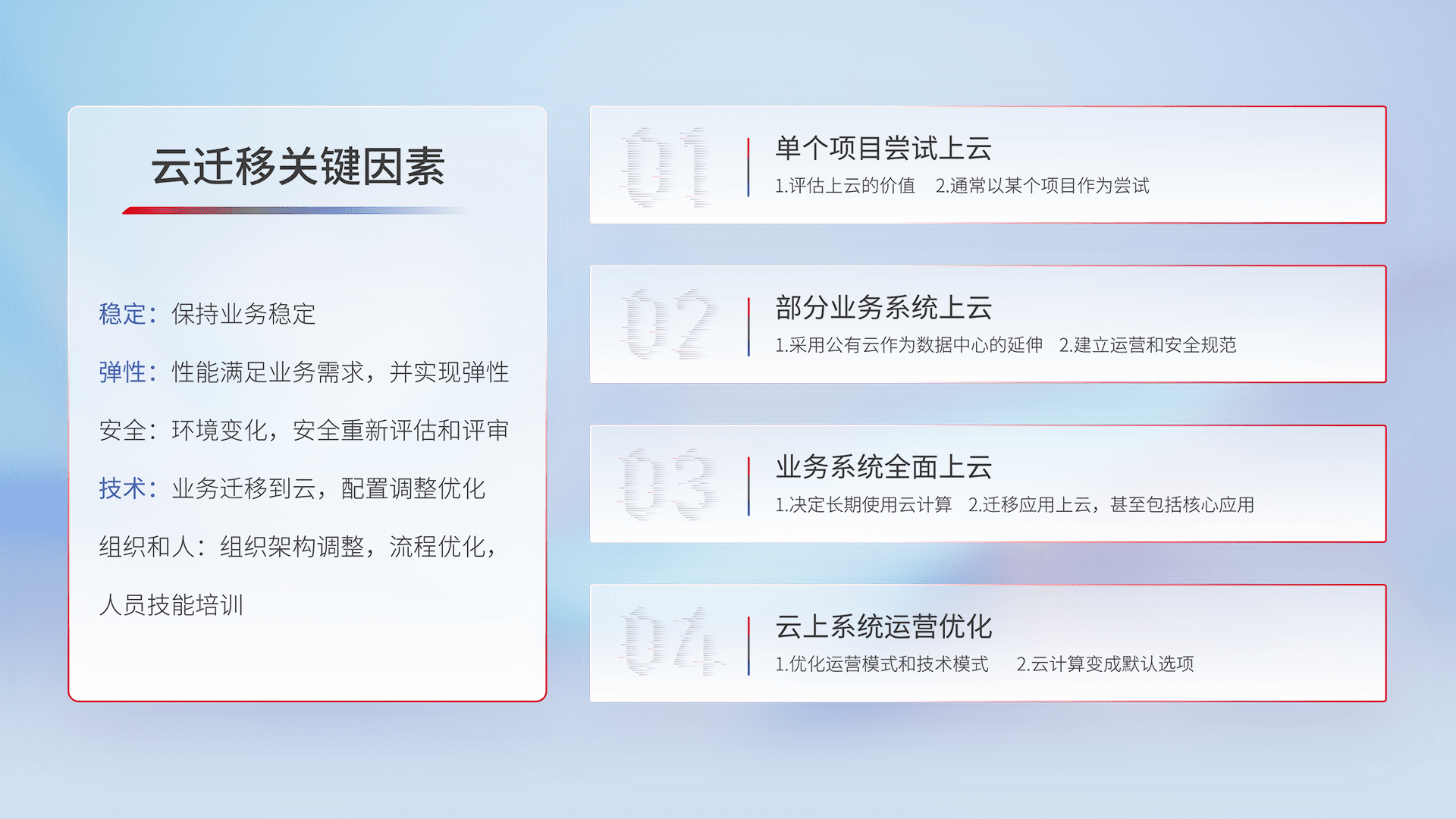 结合实际业务,,从规划设计、、、云平台选型、、、、云原生改造、、、、数据迁移、、、集成交付,,迁移全过程为客户识别最佳上云路径,,,,做好风险识别管理,,,设计网络架构、、、身份权限、、安全审计合规、、操作审计、、日志审计、、监控告警策略、、、多站点容灾设计等,,,对云上基础设施进行整体规划,,,提升IT治理水平,,,以满足弹性、、、高可用、、高性能的需求。。